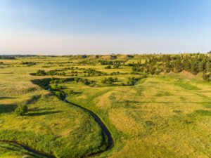The east side of the ranch is timbered and evolved into grassy plains to the west. Across the vast contiguous acerage, there are approximately 40 sizable pastures. Although the ranch is easily accessible from the interstate, it is large enough that the three county roads provide great access to the pastures, yet the ranch is very private. West of Headquarters, there are 1,200± acres of grass hay meadows along Inyan Kara Creek and a dryland hay pasture that could be used for grazing or hay production. Sitting at the western edge of the Black Hills, the ridges are covered with stands of large ponderosa pines and the bottom grounds are spring-fed, with lush grasses and a variety of brush and small deciduous trees.